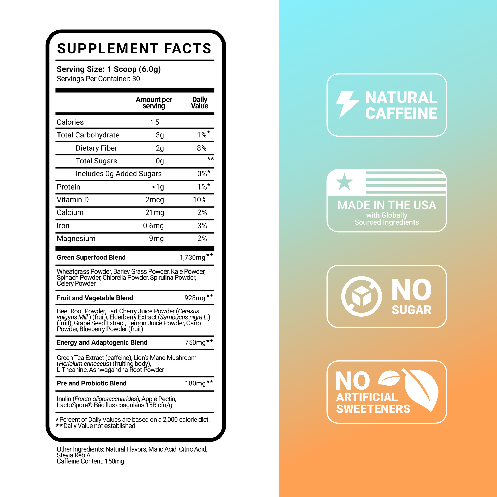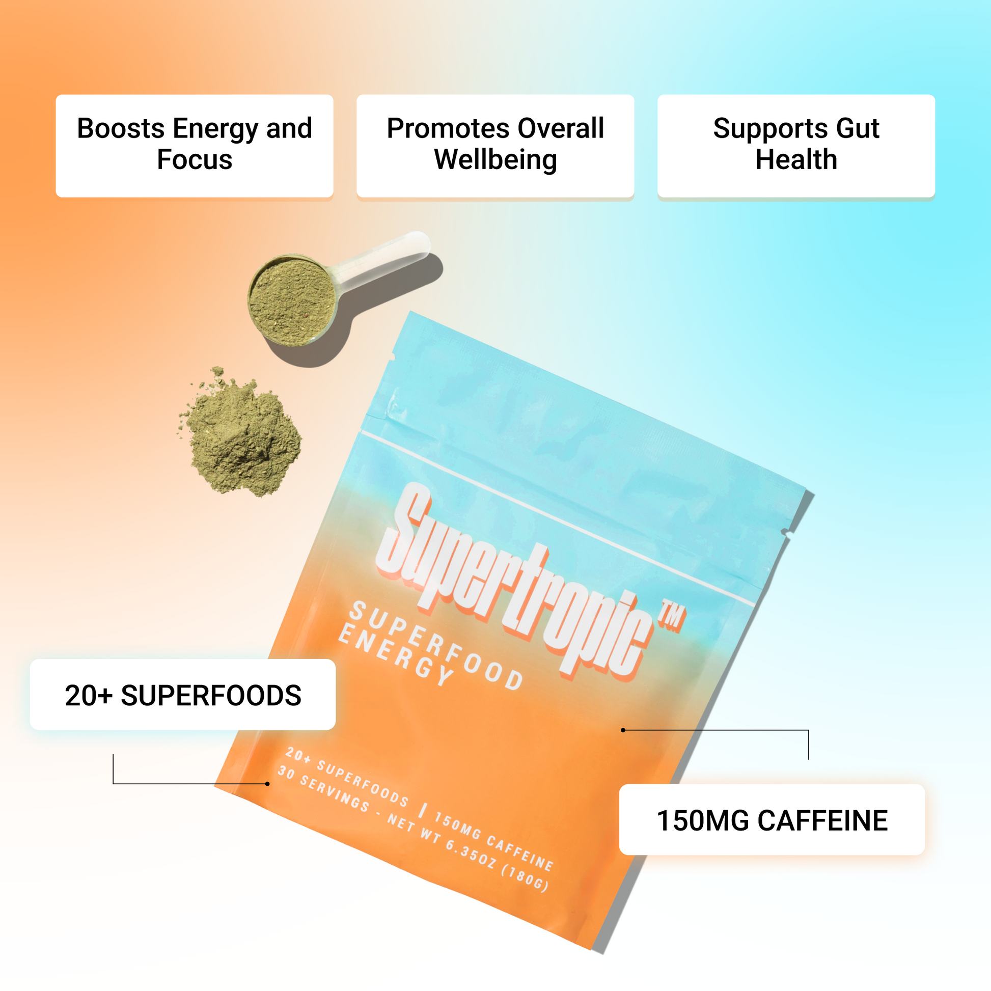 Supertropic™ is a new energy powder that combines natural caffeine and 20+ superfoods, fruits, vegetables, and more — to give you more energy and support whole body health.*